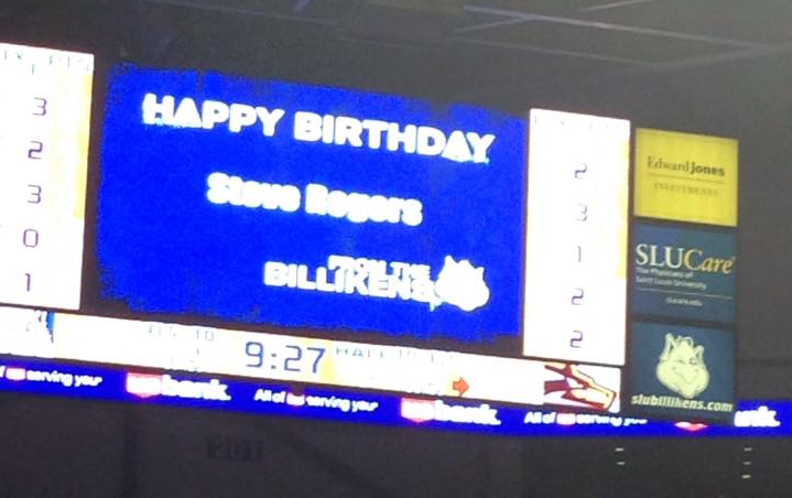 Second, on my birthday, I had lunch with my Mom, then attended the Billiken game that evening. The Billikens lost, but I made an appearance on the scoreboard for the first time probably since college.