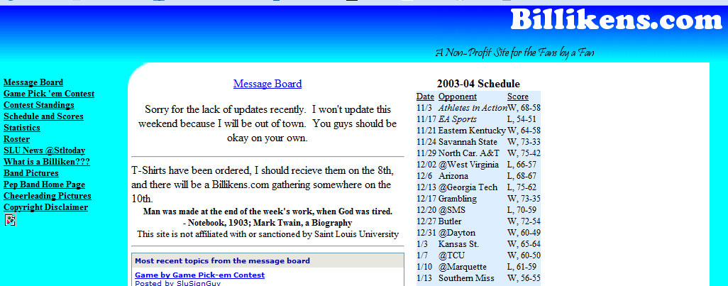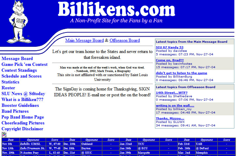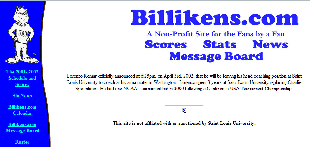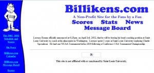 I actually cannot get a screen shot of what the site looked like for the last three years (Wayback Machine doesn’t render it right…probably because of my tweaks). I also cannot find the first version of Billikens.com. But here is the progression between then (forgive the spacing).