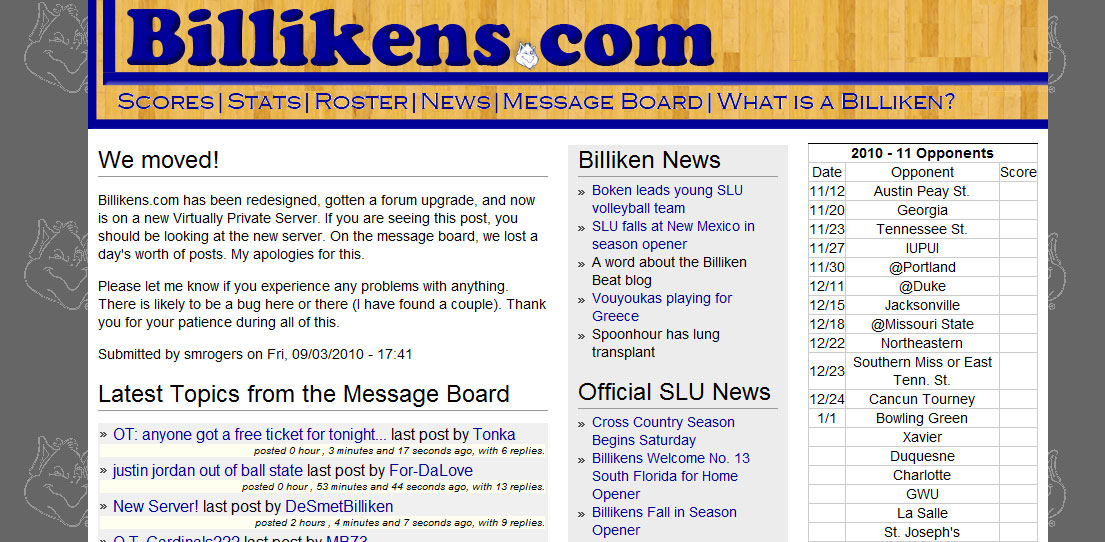 This past season, the message board became more popular. GoDaddy puts a limit of 200 on how many concurrent connections you can have to the MySQL server. This got exceeded pretty much every game from February on. With the Rick Majerus era, the site gets more traffic. It still has the old boys club, but there is some fresh blood. To put it in perspective. In August 2010, Billikens.com got as much traffic as it did in November 2008 (meaning a month before school starts got as much traffic as the first month of a season).