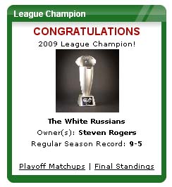 Going into Monday night, I had a 27 point lead. But Rich still had the number 1 overall draft pick: Adrian Peterson. To beat me, AP needed 150 yards and 2 TDs. After a slow first half, he got 2 TDs in the second. The Vikings were driving to the tie the game as the clock was running out, and thankfully AP was not on the field for the game tieing play. However, there was overtime, giving Peterson the opportunity to rack up yards. On Peterson’s 137th yard, only 13 away from tieing The White Russians, he fumbled! The Bears scored on the next play, securing the win and The White Russian Fantasy Football Championship.